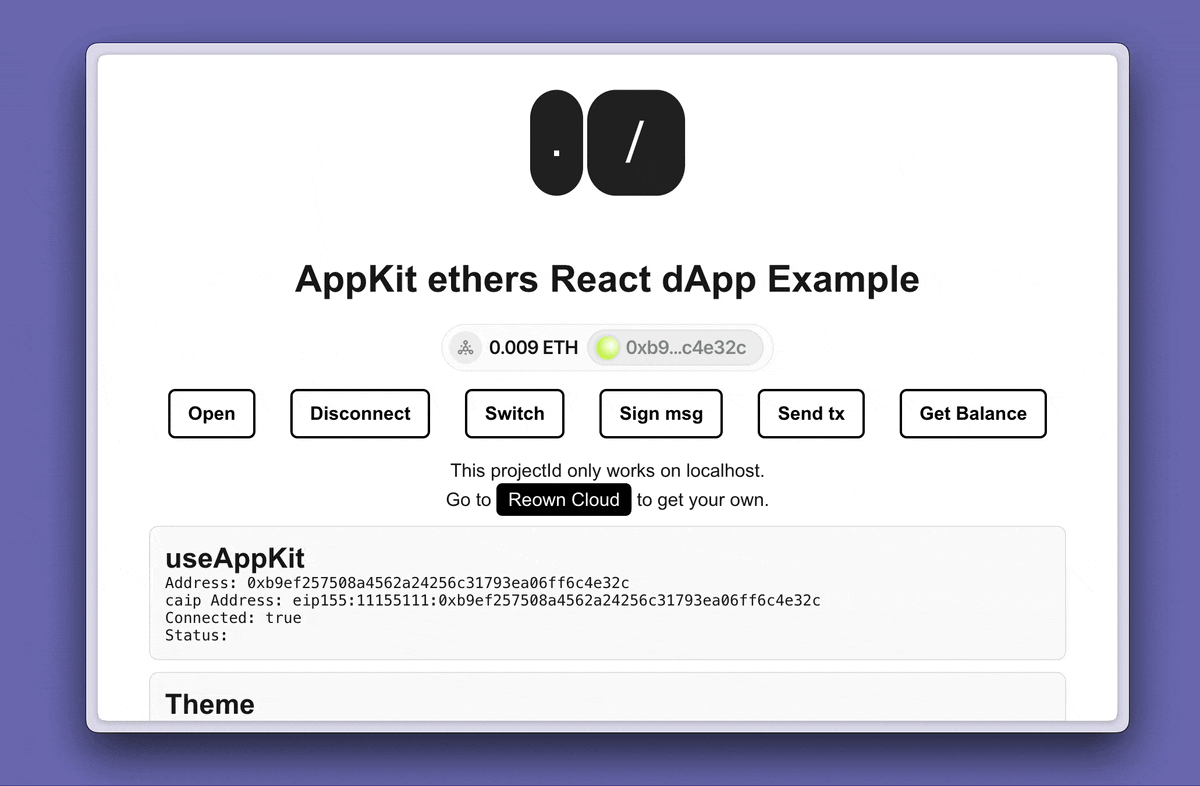 useAppKitAccounthook to retrieve the user’s address and check if they are connected. TheuseAppKitNetworkCorehook to get the chain id and theuseAppKitProviderhook to get the wallet provider.